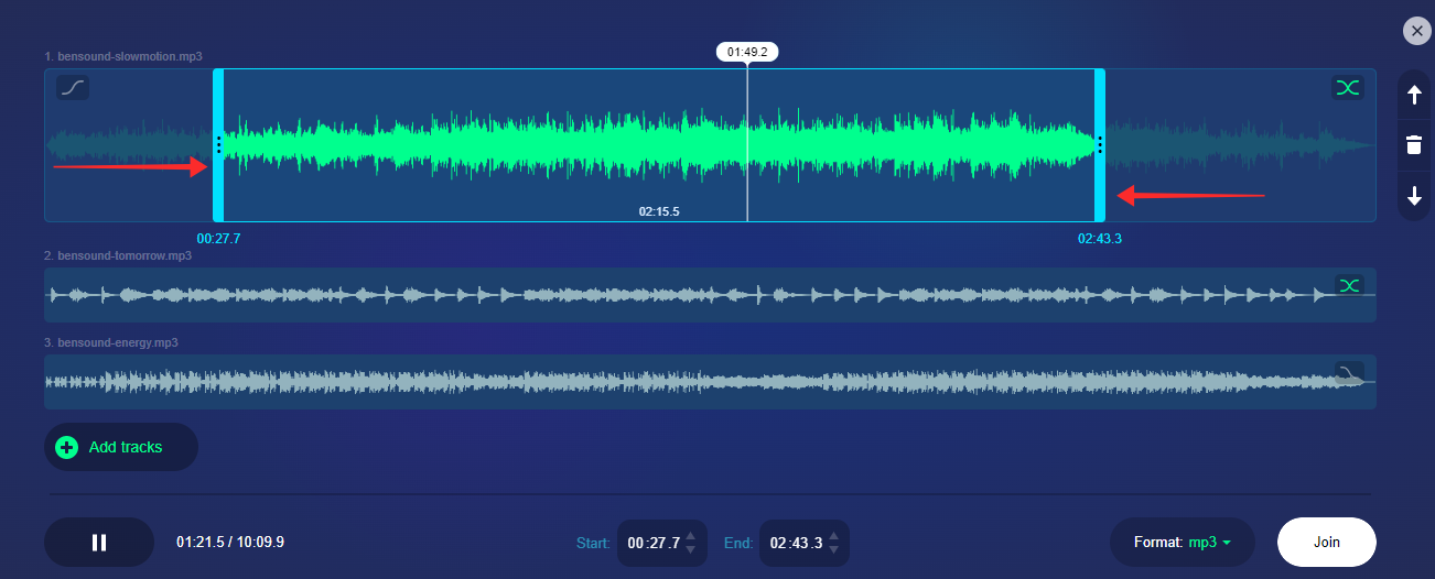 Trim the audio from beginning or end to determine the selected area of the song to be conjoined with the other audio tracks.