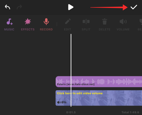 Listen to the preview and make adjustments as you see fit to the track and hit the checkmark to exit the music editor.