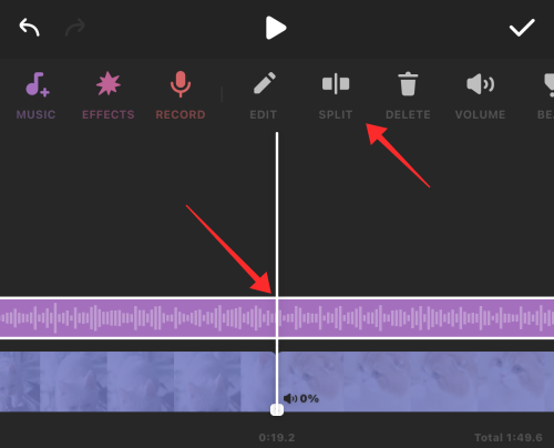 On Inshot, you can more than just trim a song from the beginning or ending portion but even split a track into two at any point to make different units of a song. These units can be used as independent music clips for the video. To split music, seek the correct time frame on the video and tap SPLIT.