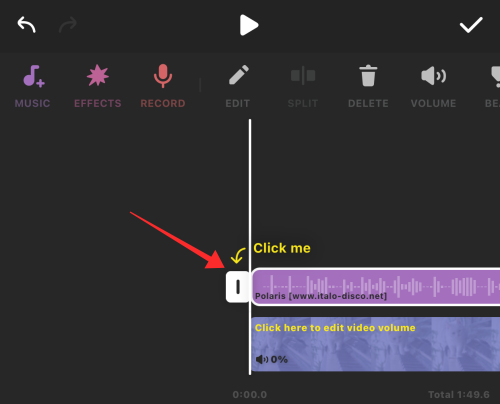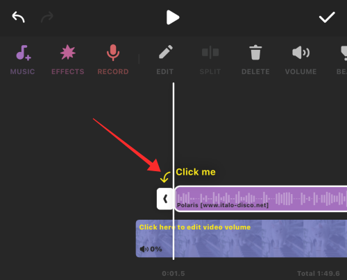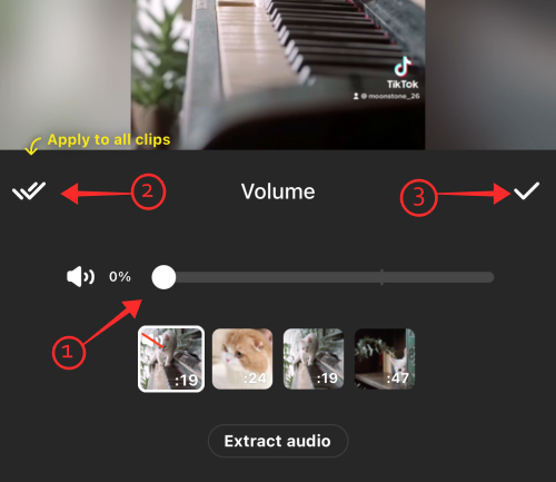If you do not wish to keep the original sound decrease the volume on the slider to 0. If you wish to mute or apply the same volume level to all the clips on the timeline, tap the double checkmark button on the top left of the panel. Finally, tap the single checkmark on the top right to apply the changes and exit volume control.