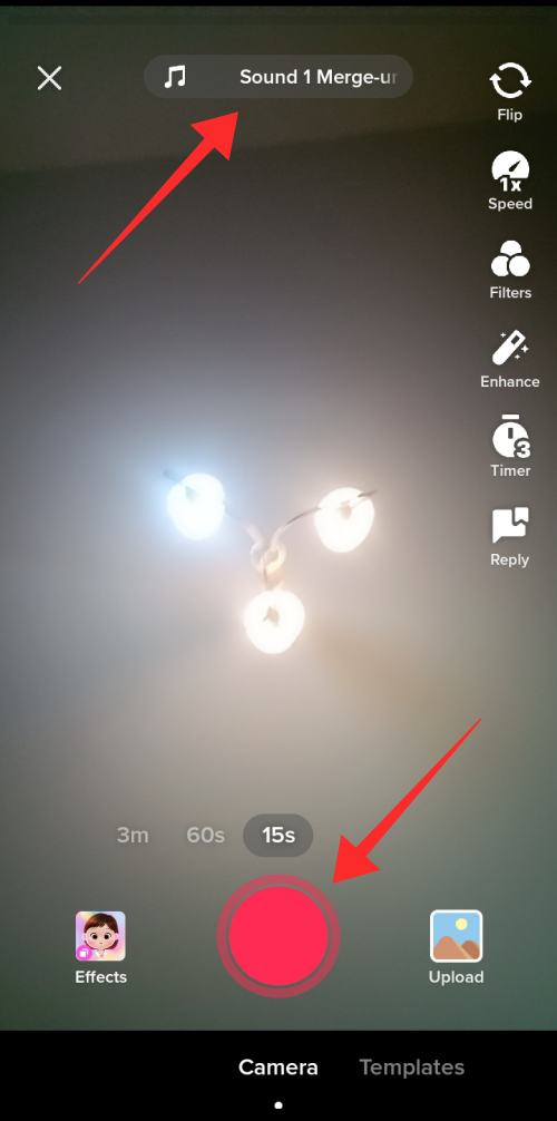 You can see the sound title running in a marquee on the location of Add Sound tool on the create page. Tap the red record button to start filming.