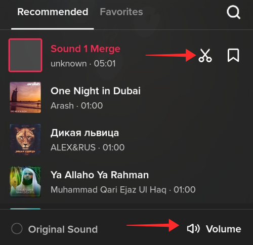 To trim the sound, tap the scissor icon; to add it to your Favorites, hit the bookmark icon. If you wish to increase or decrease the volume of the added sound, tap Volume. Since the video was filmed with Added Sound, Original Sound is not available for it. If you add the sound after filming in the editor, then your video will have both Added sound (Background sound) and Original Sound.