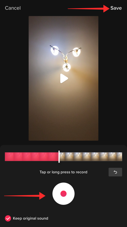 Long press the record button to add voiceover or live sounds from your end and tap Save to return to the editor.