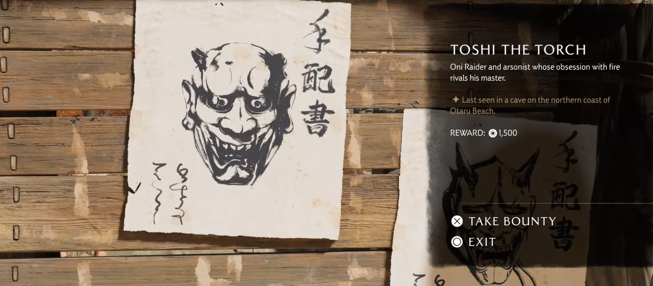 Go to Ishikari Market and locate the bounty board near the bounty broker Kojiro. Accept the "Toshi the Torch" bounty from the board. This bounty is available by default and can be tracked on your map.