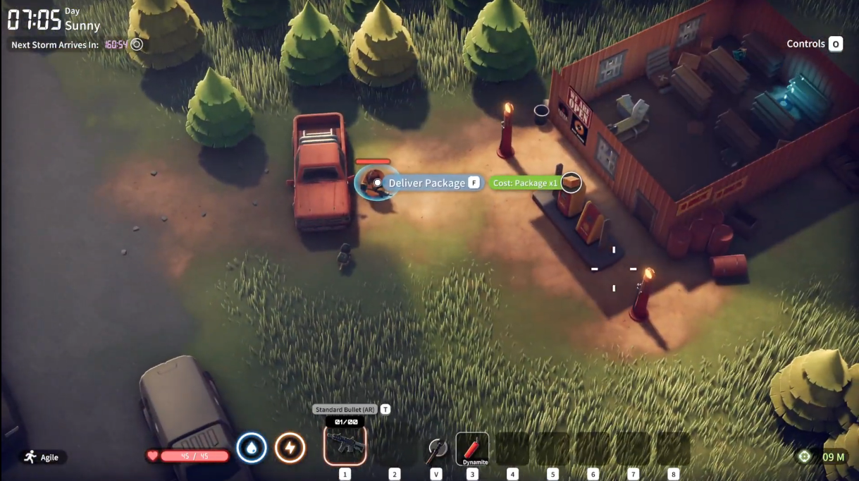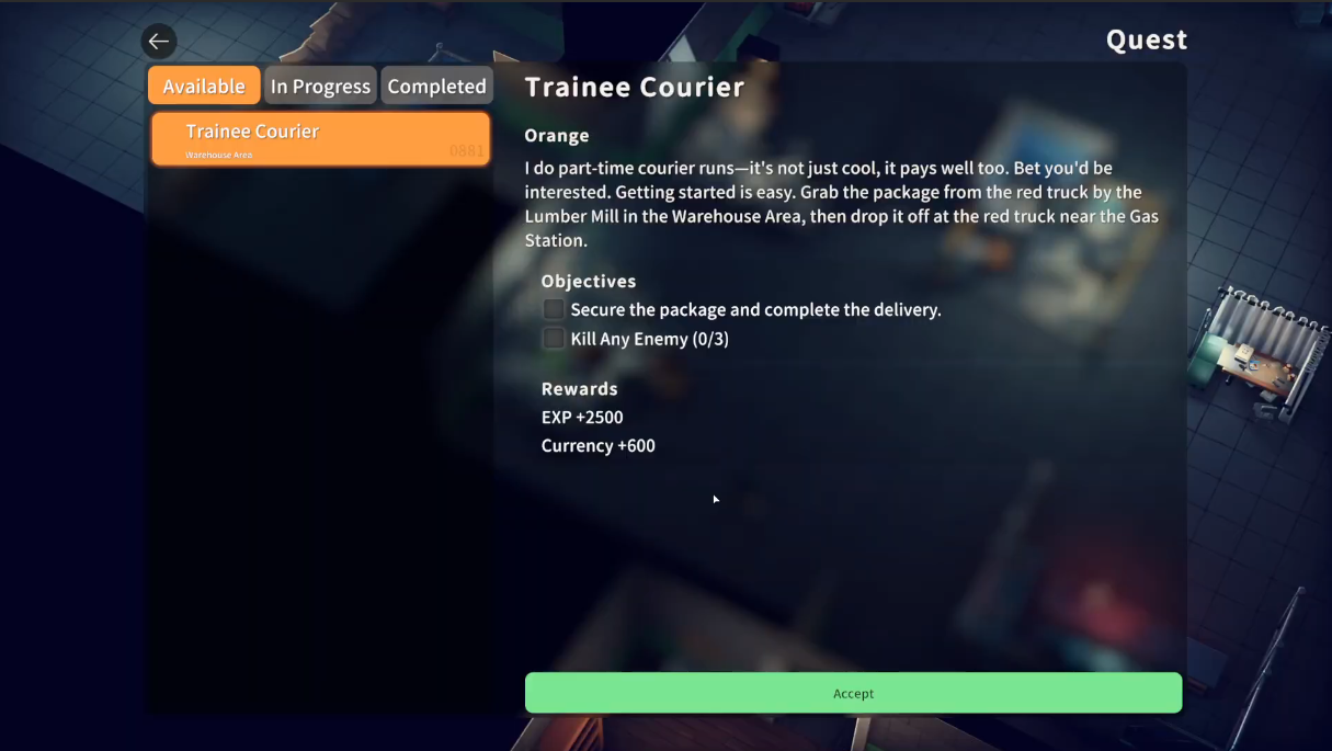 “I do part-time courier runs — it’s not just cool, it pays well too. Bet you’d be interested. Grab the package from the red truck by the Lumber Mill in the Warehouse Area, then drop it off at the red truck near the Gas Station.”