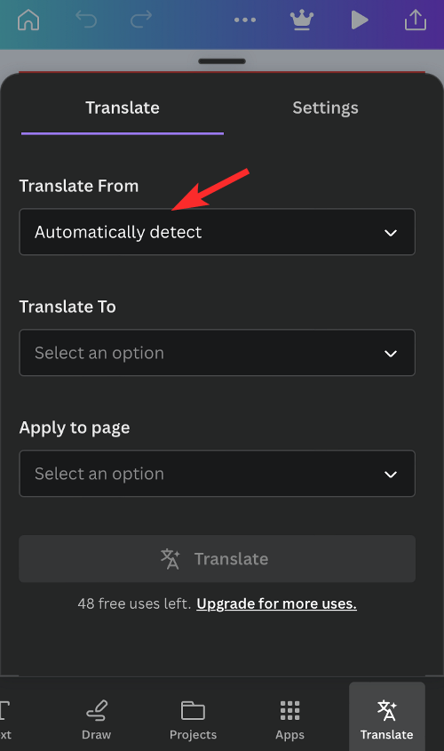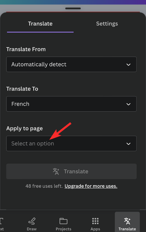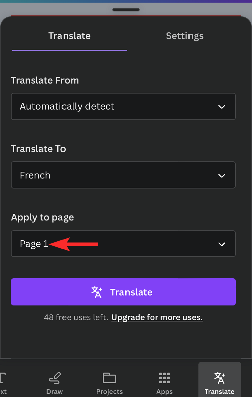 9. Now, click on the Apply to page dropdown box and select the page number that you wish to translate. Canva only lets you translate content from one page. If you have multiple pages inside your design, you will have to translate each page individually.