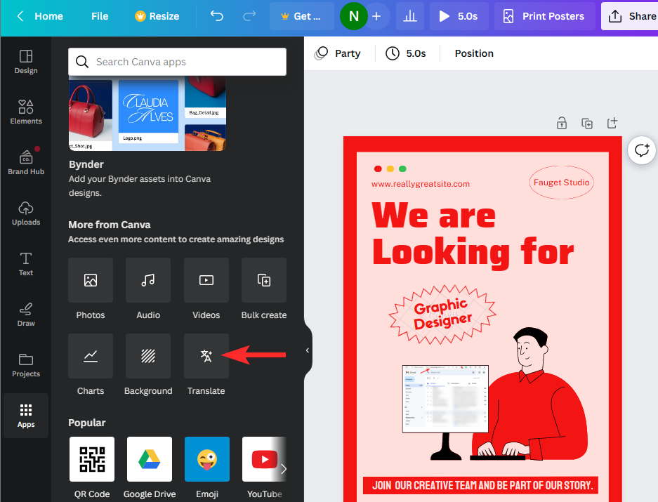 5. From the list of apps that appear on the right, scroll down and click on Translate under “More from Canva”.