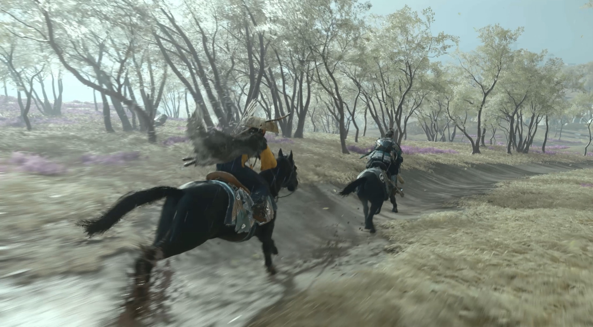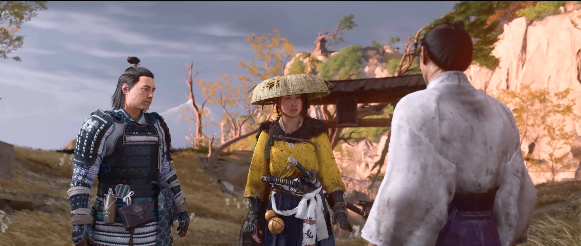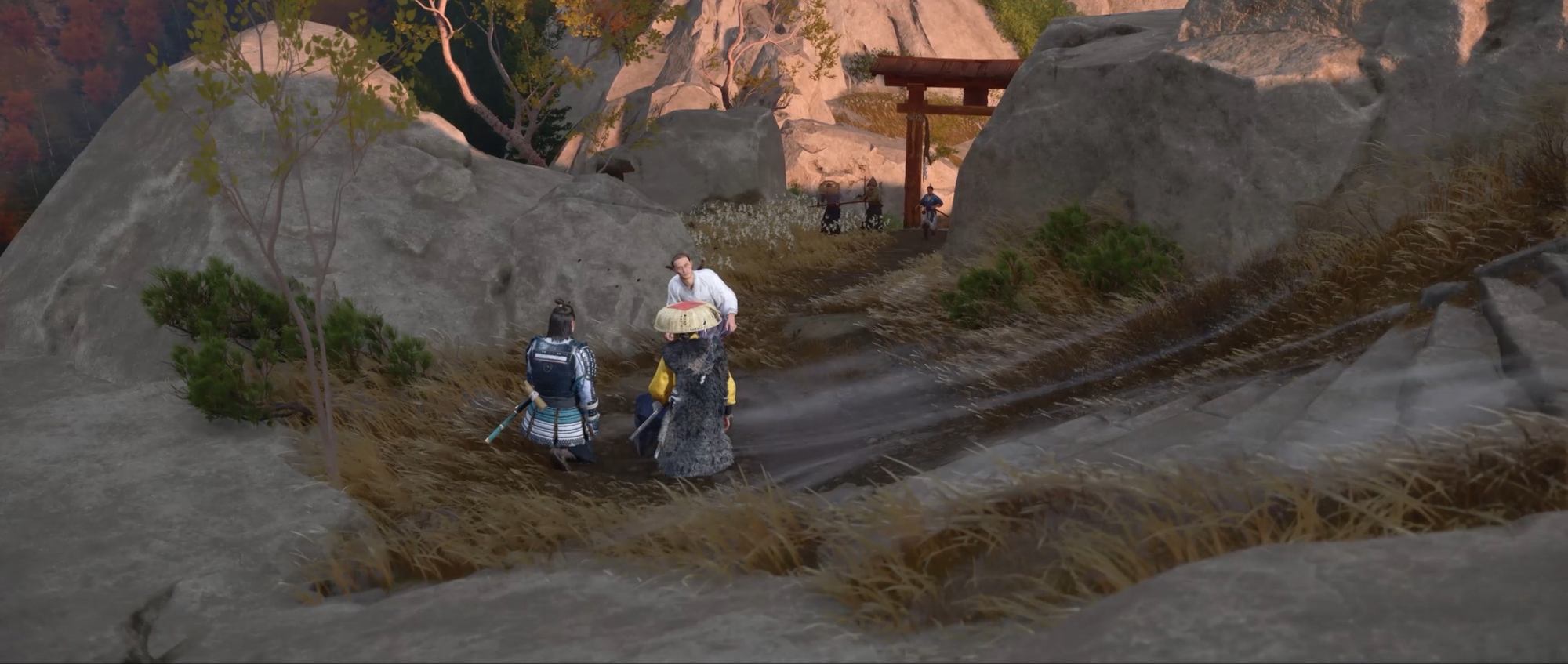 After reaching the shrine, you observe the bounty hunters around the area. Go to the left side and climb the cliff with Jubei. Continue the path until you come across a bunch of Ronin in the area.
