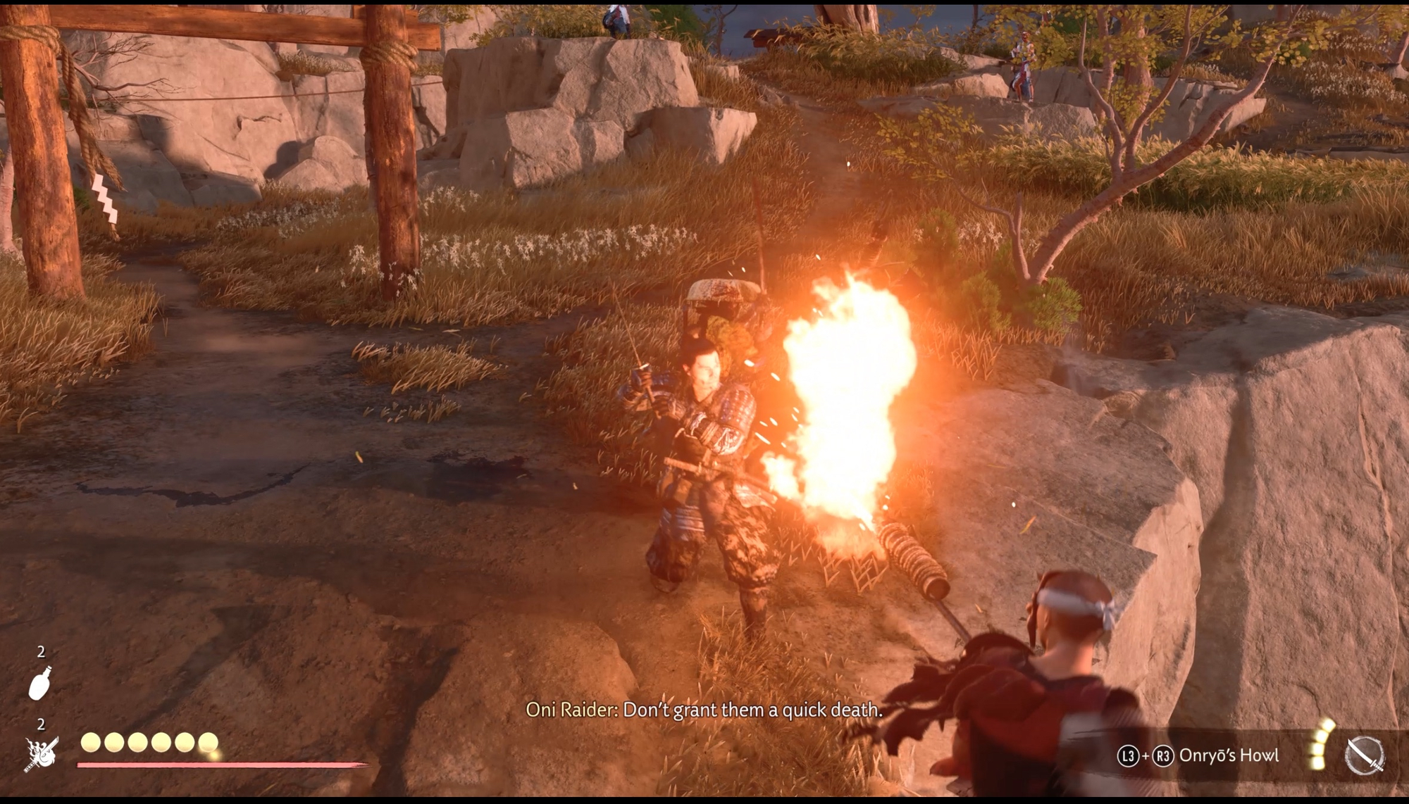Defeat the ronins as they surround the shrine. Use Oni's Flame to kill the enemies for additional assitance. Else, fight as you like.