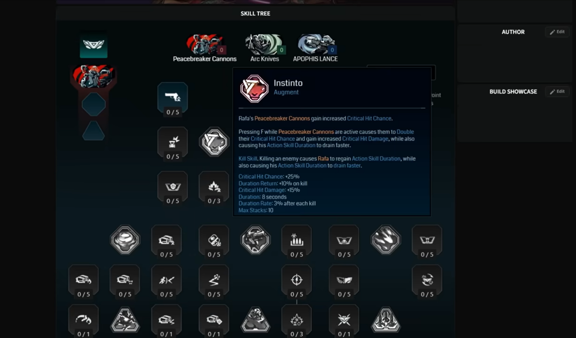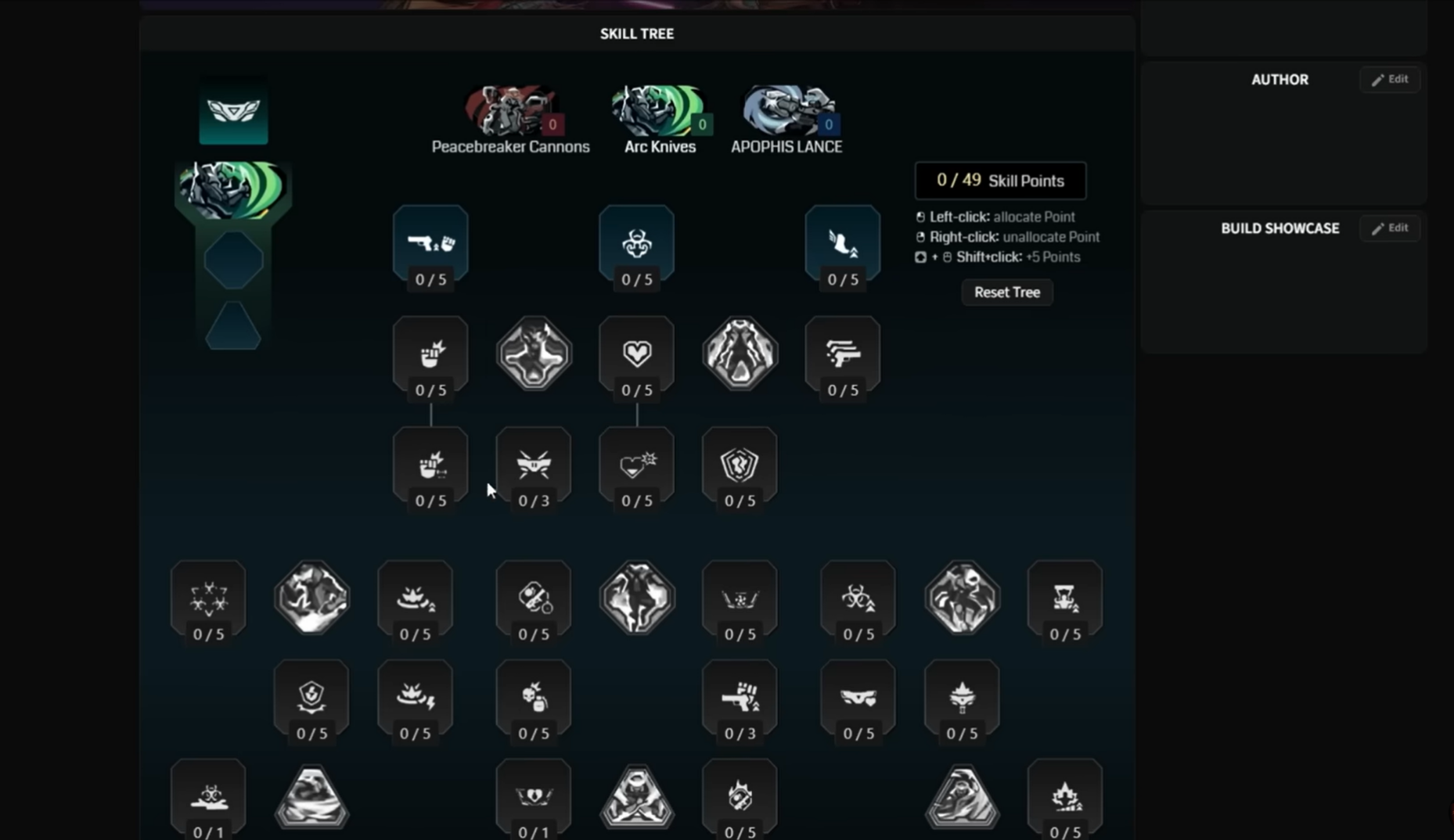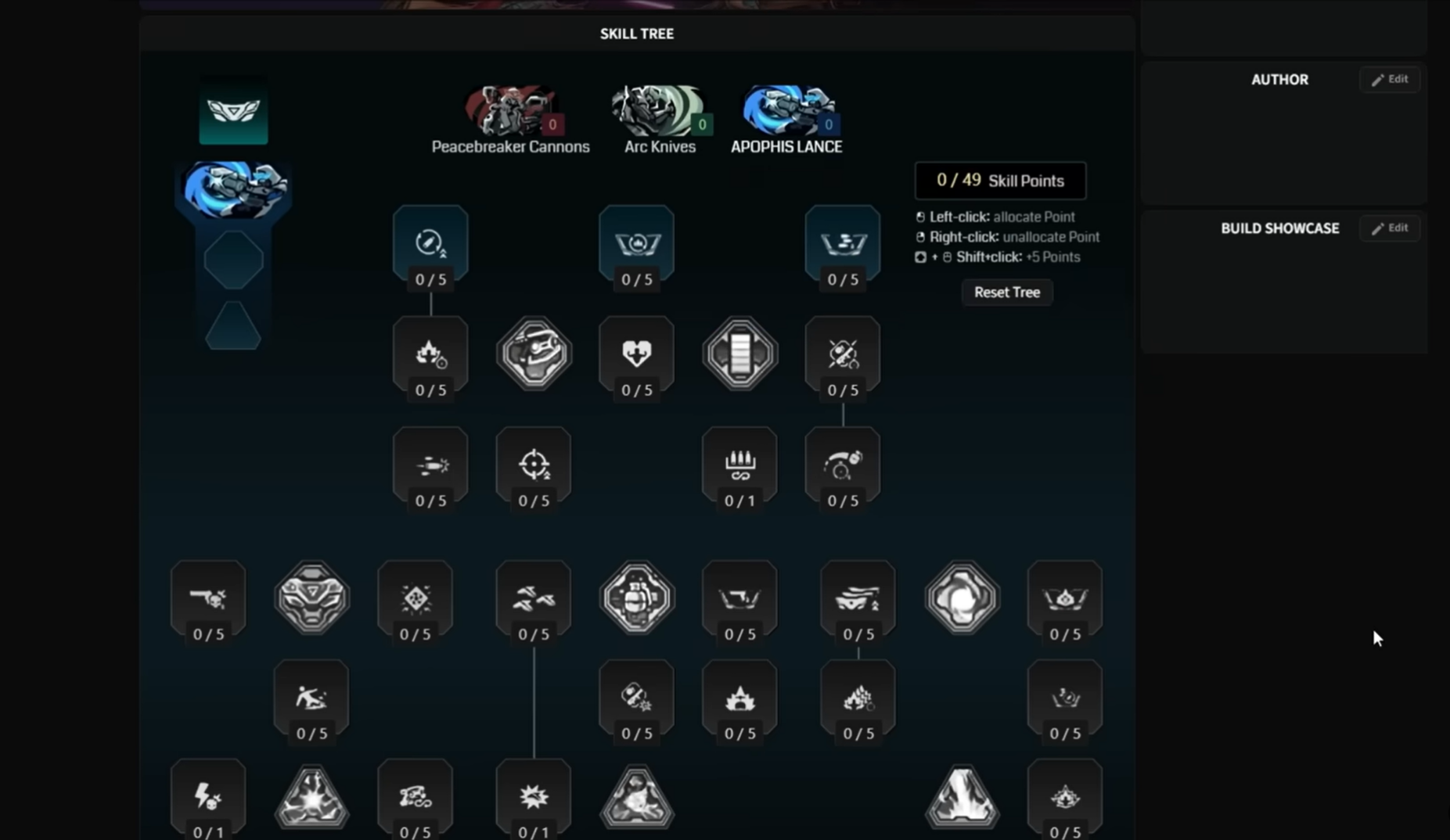 Pick an Action Skill that matches your preferred combat style. APOPHIS Lance suits long-range bursts, Peacebreaker Cannons excel at sustained indirect fire, while Arc-Knives focus on mobility and melee pressure.