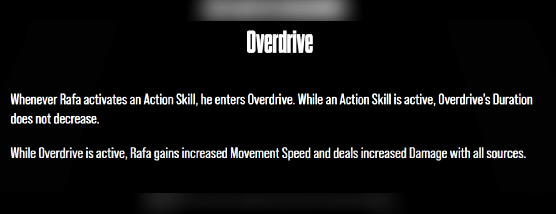 - While Overdrive is active, Rafa’s movement speed and damage increase.