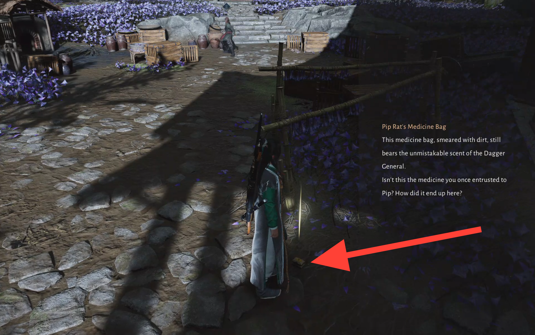 After reaching the marked location, investigate Pip Rat’s Medicine Bag lying on the ground in front of the house.