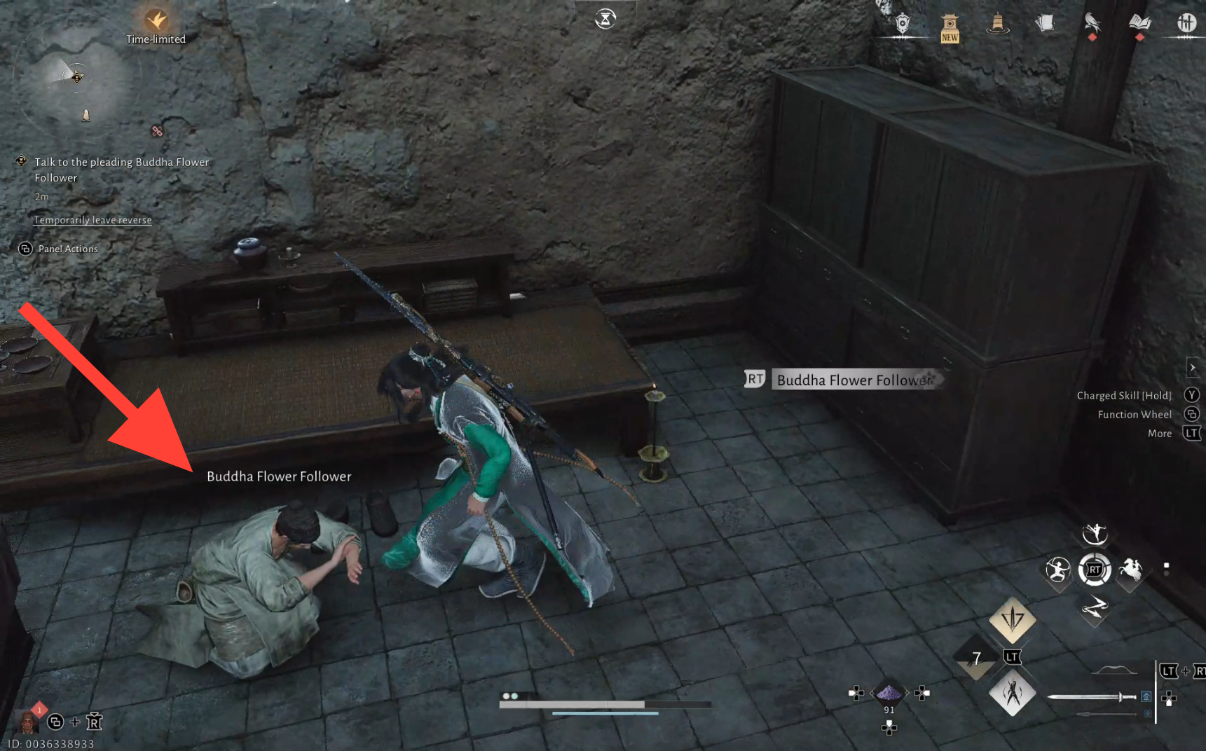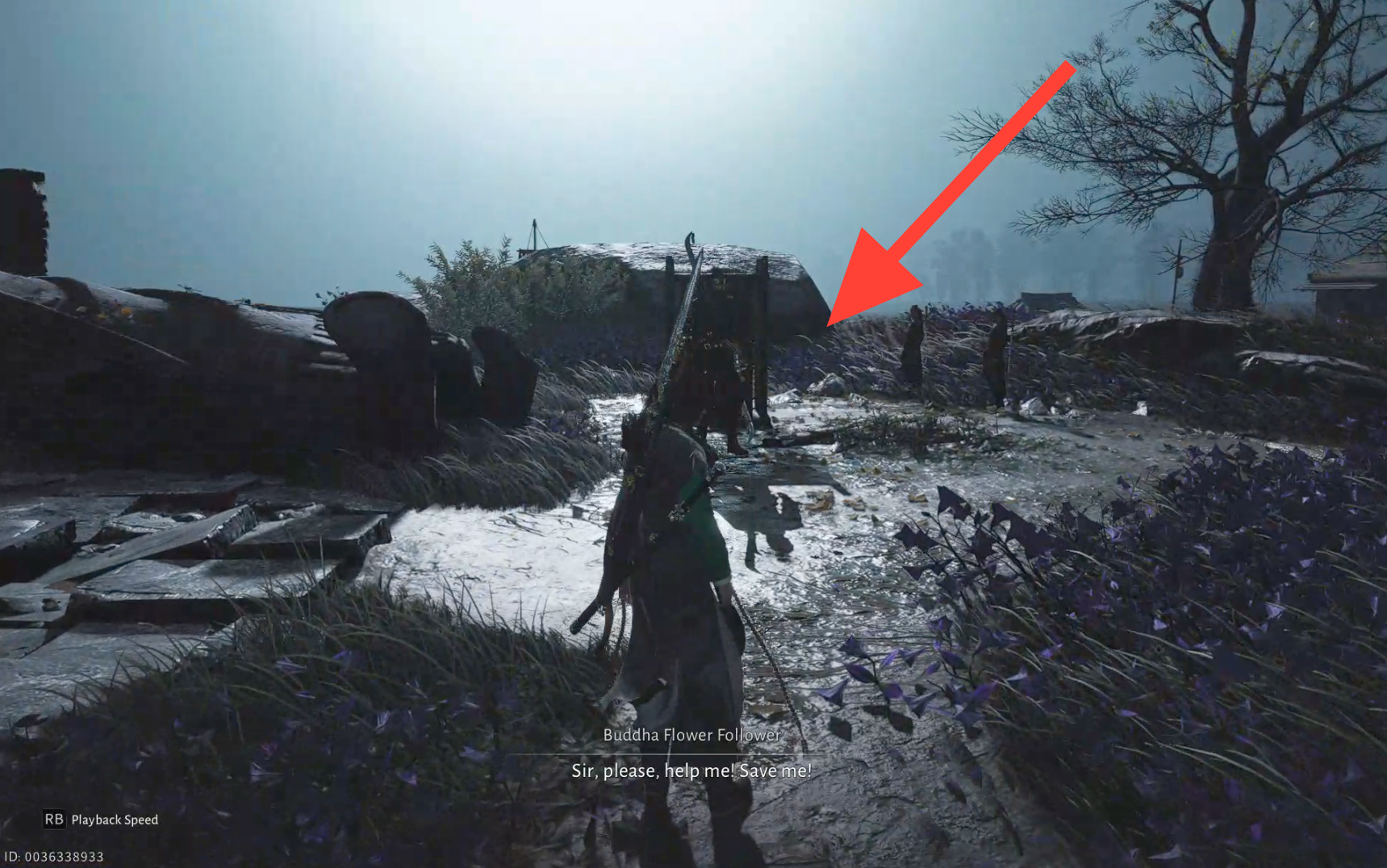 Speak with the pleading Buddha Flower Follower, then follow him outside—where you’ll be led straight into an ambush.