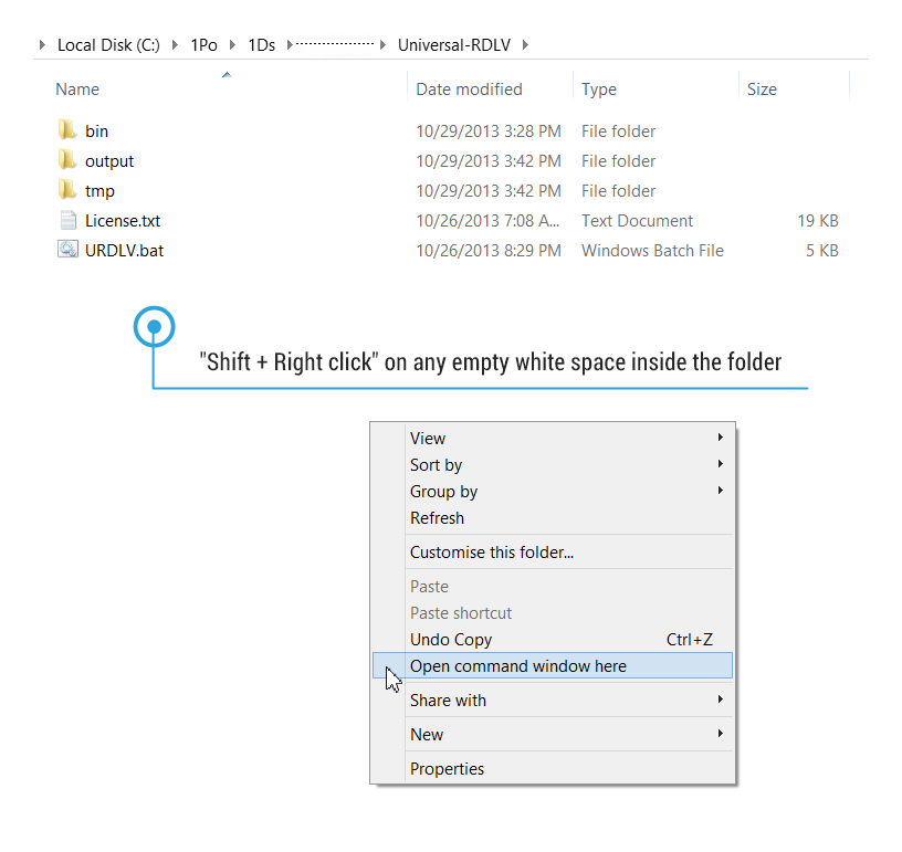 └ If you have a anti-virus program installed, and it’s trying to delete some of the extracted files, then disable it for a while and re-extract the Universal-RDLV.zip file again, making sure nothing gets deleted. - Open a command prompt window inside the folder where you extracted the Universal-RDLV.zip file. Press “Shift + Right click” on any empty white space inside the folder and then select “Open command window here” option from the context menu