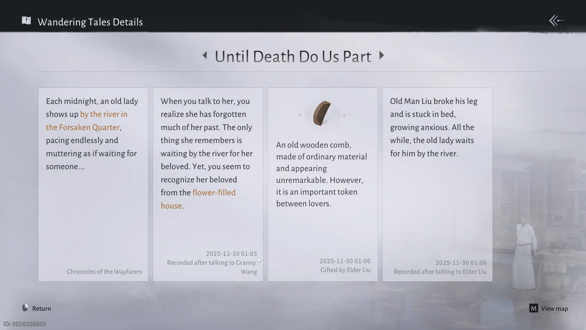 Until Death Do Us Part is a gentle but heartfelt Wandering Tale that highlights the emotional depth of Where Winds Meet. By helping Granny Wang reconnect with a forgotten memory, you earn meaningful rewards—and a beautifully written moment.