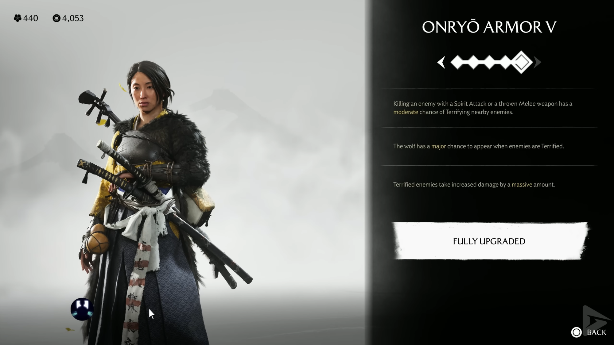 | Onryo Armor II | Clear 1 Yotei Six revenge quest | Gains all three base perks: terrifying enemies, Wolf summon chance, increased damage to terrified foes |