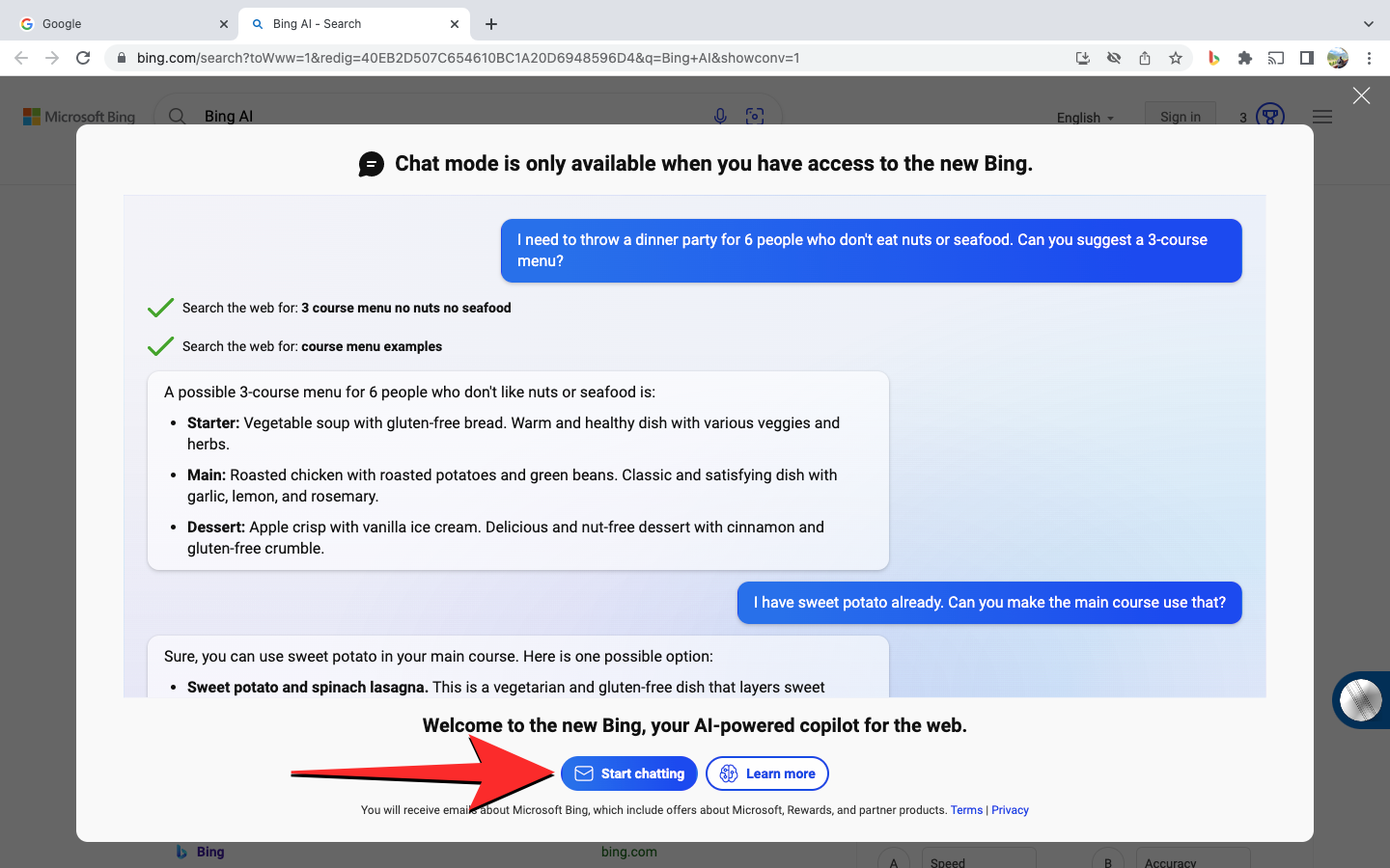 A new tab will open inside Google Chrome showing you the Bing Chat loading page. Here, click on Start chatting at the bottom.
