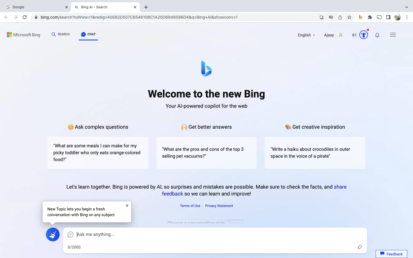 Once Bing Chat has been enabled on Chrome, you can directly access it by clicking on the Bing Chat extension icon and the AI chat will open up on a new tab.