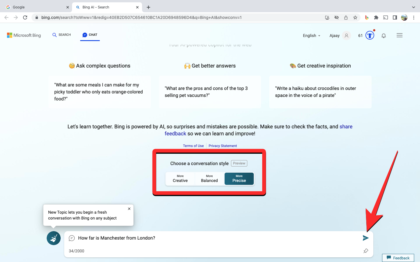 You can scroll down on this screen to choose your preferred conversation style with Bing. Once that’s done, you can type your query and click on the Send icon at the bottom right corner to start using the AI chatbot.