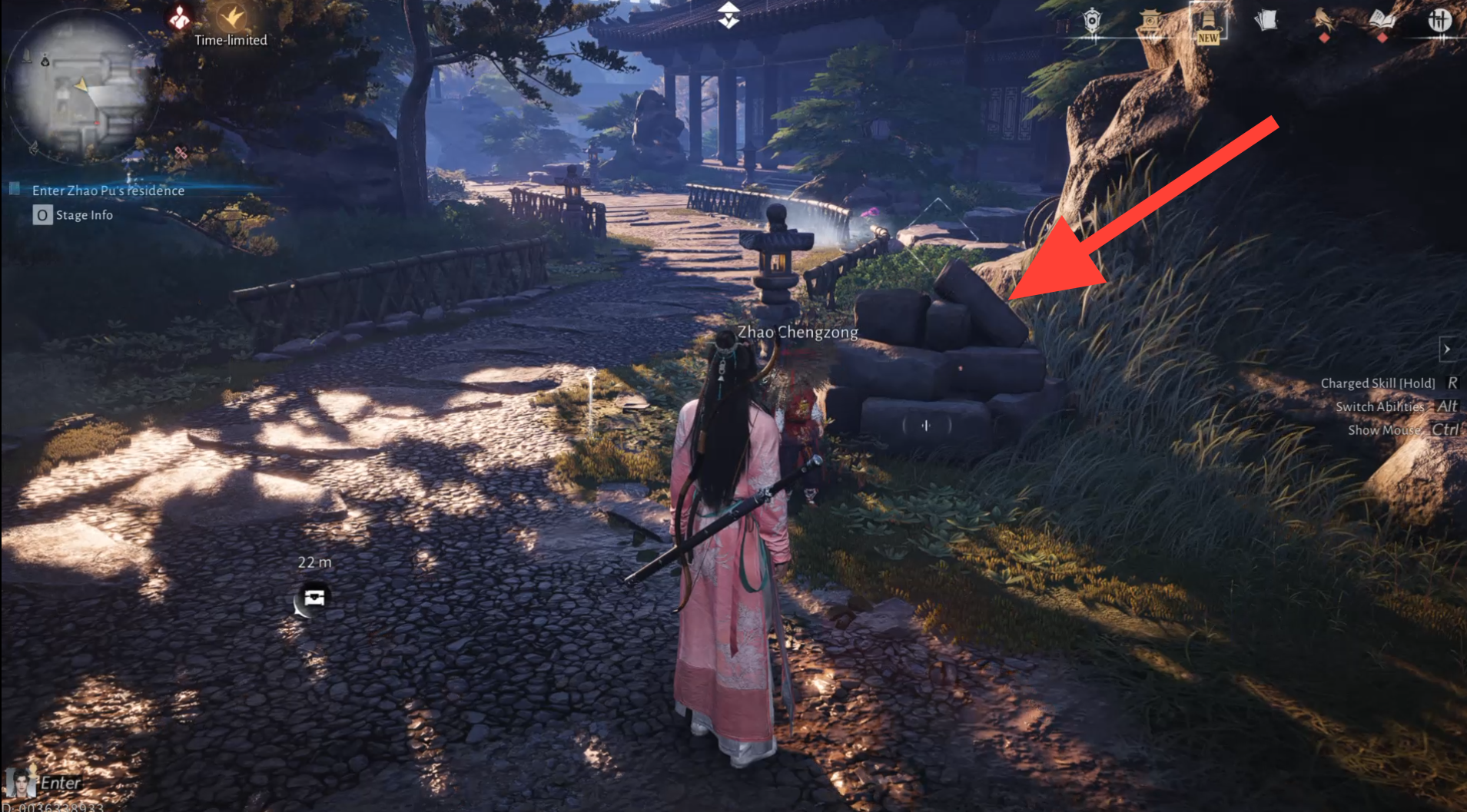 - Use the small broken section in the wall to enter Zhao Pu’s residence instead of climbing the walls to avoid being reset.