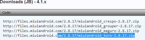 - Download the latest version of the ROM from its download page. Download the “toro” version of MIUI under the 4.1.x heading (see screenshot below):