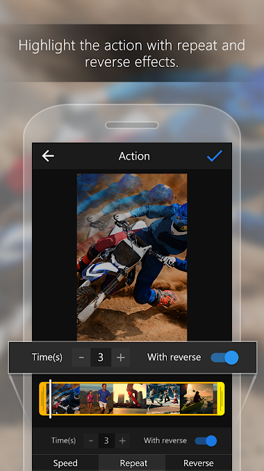 The app lets you take decent control of the speed of your video, letting you speed it up, slow it down, or even play it backward. You are also presented with some really cool effects and transitions to make your video pop. FilmoraGo offers Picture in Picture (PIP) letting you watch your edited video while comparing it to the unedited version.