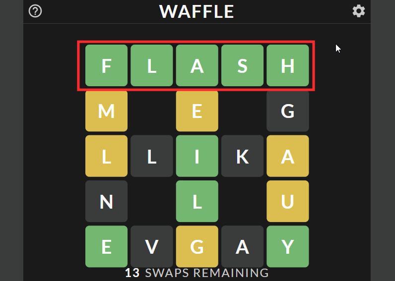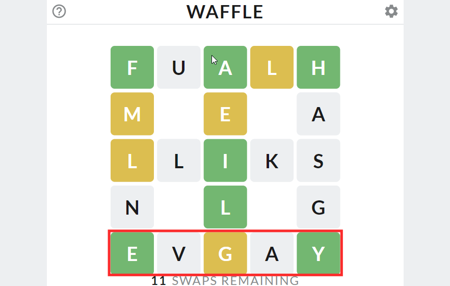 As all the letters on a Waffle grid are valid in the game, the gray feedback only indicates the absence of the letter in the row or column under consideration. Your follow-up moves should factor in multiple answers at once to make each move count.