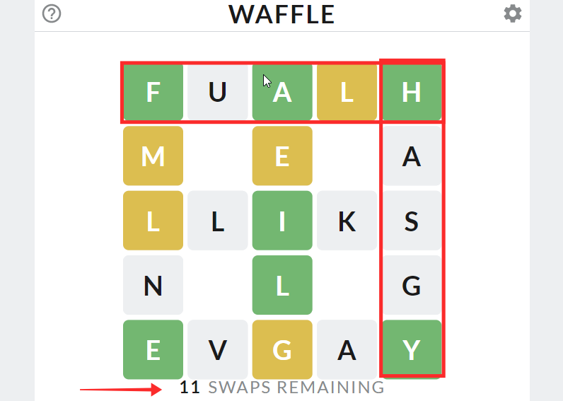 However, the wiggly element on Waffle is the crossroads. If you find a yellow letter that is stationed at the junction of a row and column, then it indicates that it could be a part of either. Under such circumstances, you need to envision multiple scenarios of solution words to avoid wasting the available swaps.
