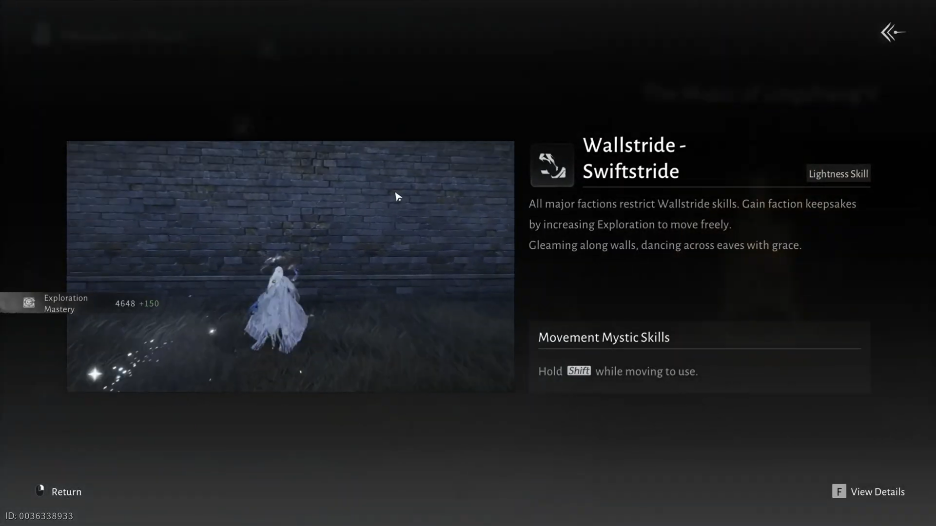 Wallstride – Swiftstride is a Lightness Movement Mystic Skill that allows your character to run along walls by holding Shift while moving. It’s used for scaling architecture, navigating tight spaces, and improving overall exploration flow. Factions initially restrict it, so you must progress Exploration/Faction Keepsakes to unlock its full functionality.