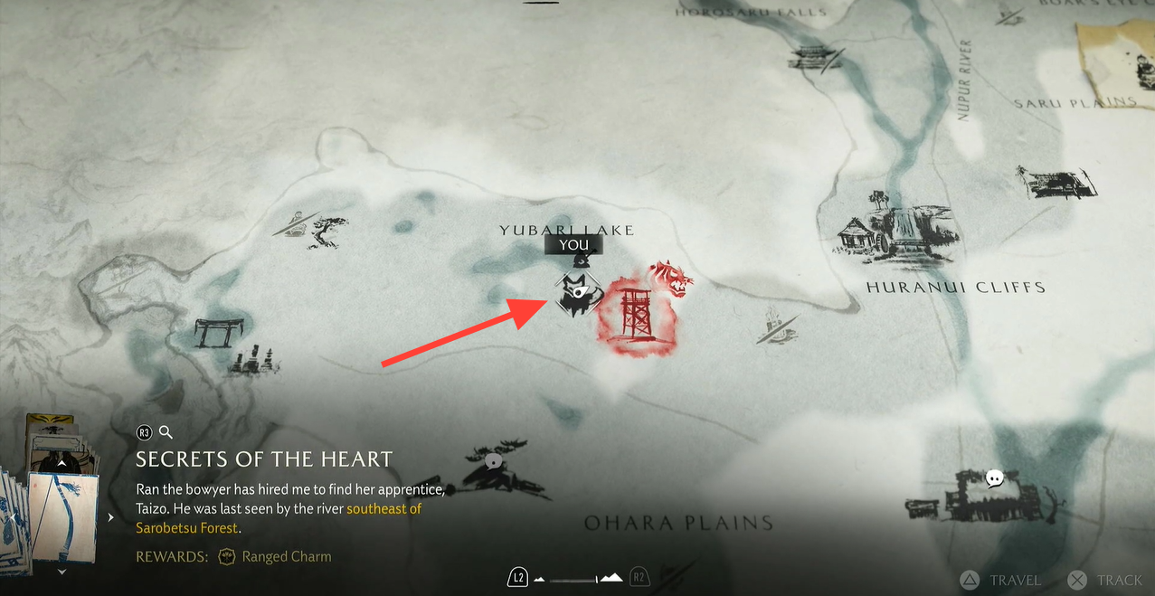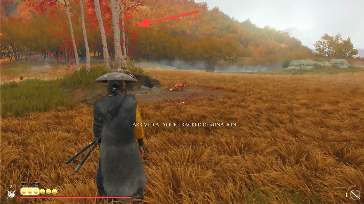 The Warm Plains Fox Den is found in the Tokachi Range, specifically on the southeastern side of Yubari Lake, just west of Saito Encampment and south of Ainu territory. Look for a cluster of tall, thin trees with glowing red leaves that stand out vividly in the environment—these mark the den.