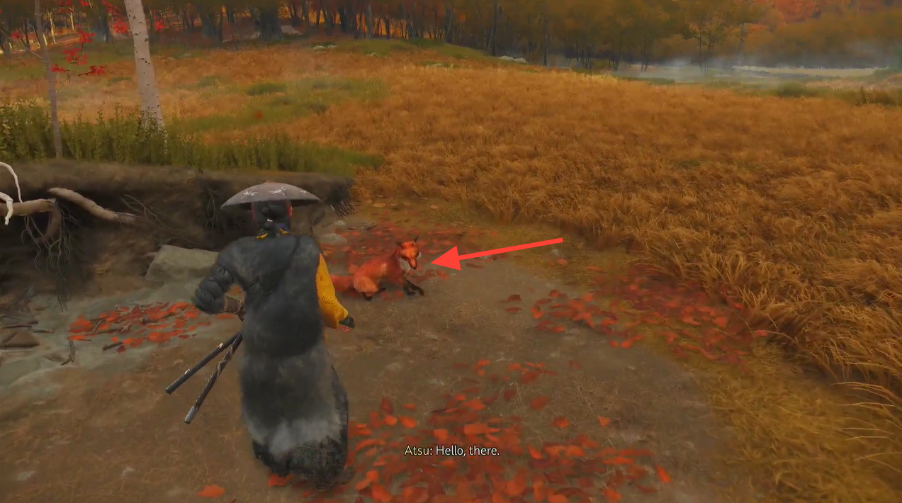 Near these trees, you will find a fox. Approach it gently and begin following it cautiously. The fox will lead you through various terrain challenges that may include natural obstacles and minor encounters.