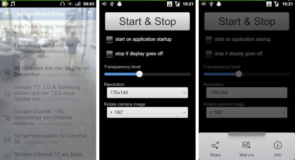 Using Transparent Screen is simple. Run Transparent Screen, press the Start button, then press the home button and continue doing whatever it is you want to do, be it browsing the internet, writing a message, checking your Facebook, or playing a game, and keep yourself from running into anything thanks to the transparent camera feed. You can change the level of transparency from the app, as well as the camera feed resolution. Sticking to the default resolution is recommended though, as increasing it can cause the phone to stutter as it struggles to keep everything running smoothly. You can also rotate the camera image in 90° steps.