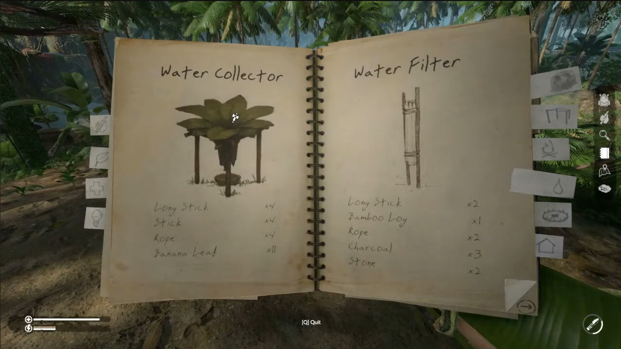 - Notebook unlock: If you haven’t found one yet, open your notebook and go to the “Water” tab. The water collector recipe should appear there once you’ve progressed far enough to unlock basic water structures.