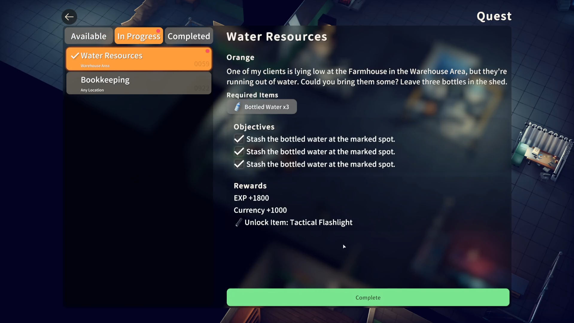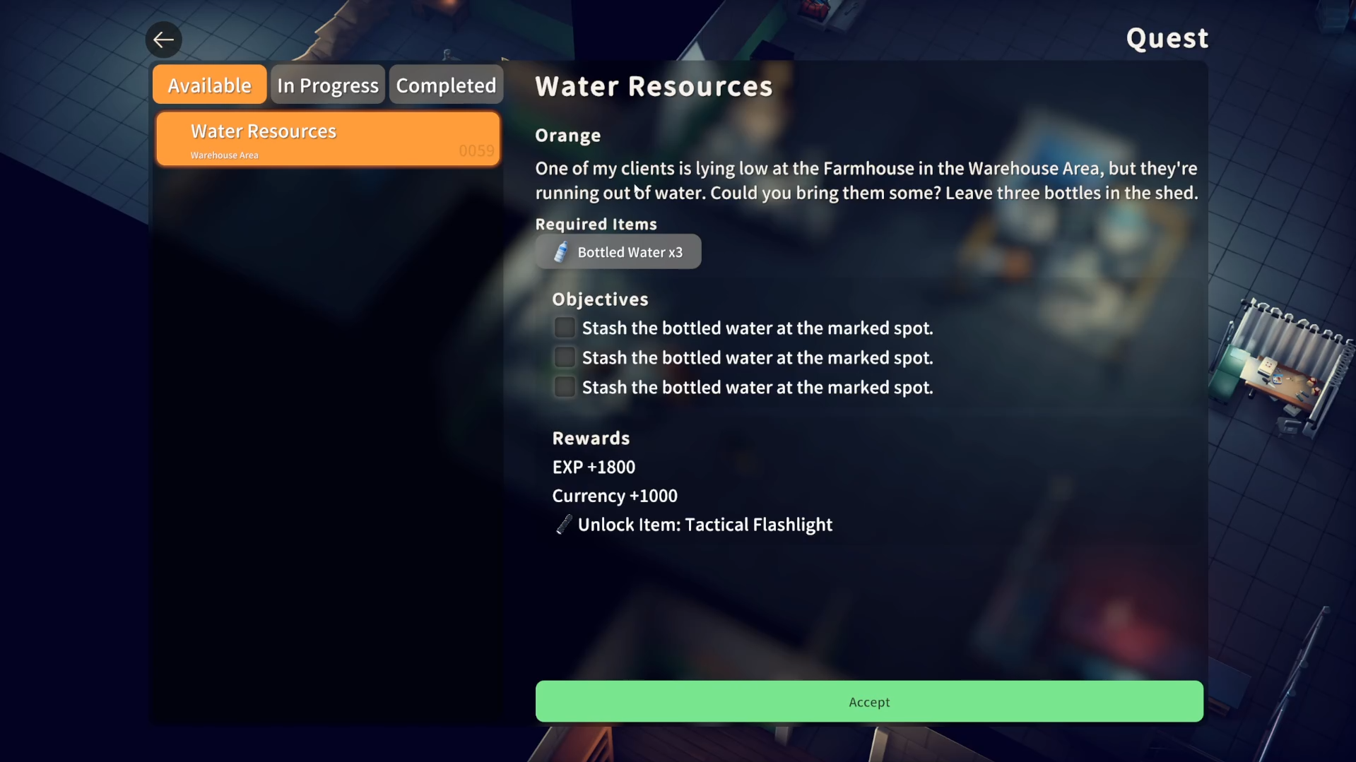 "One of my clients is lying low at the Farmhouse in the Warehouse Area, but they're running out of water. Could you bring them some? Leave three bottles in the shed."