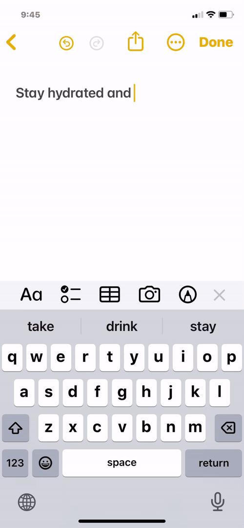 Here, you can start typing some text using the iOS keyboard. As you type, iOS will learn the words you type and generate predictions based on the text you’ve already entered. Midway through a sentence, you may see an inline text in grey that iOS has predicted you would use to complete that portion of the sentence.
