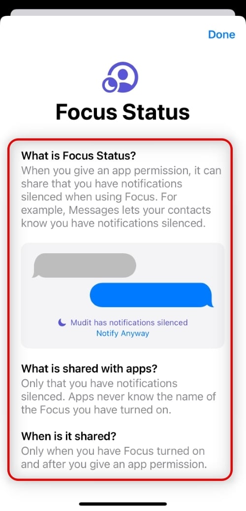 No, your Focus name will not be shared with anyone, be it the concerned app or the contact. Your contacts and app will only be notified that you have your notifications disabled. They won’t be able to tell which Focus mode is currently active on your device or what is it named. Apple has an exclusive page about the same which can be found in the Focus Status section.