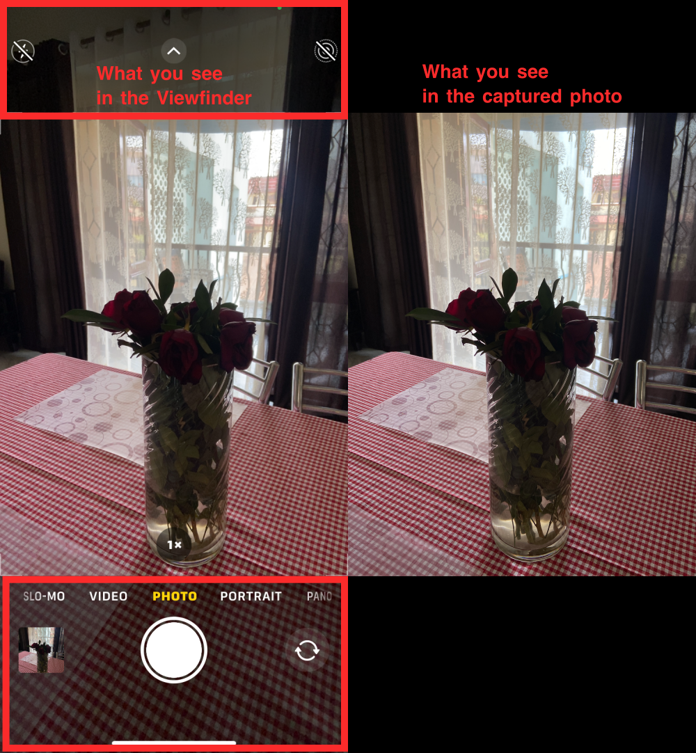 When you point your iPhone 11’s primary camera (at 1x magnification), you will see that the viewfinder shows some objects in the frame clearly while other objects outside this frame are tucked behind the shutter button and other camera settings at the top and bottom. The objects outside the frame are hidden underneath a dark gradient so that you can see what the iPhone 11’s extra camera – the ultra-wide-angle camera can see.