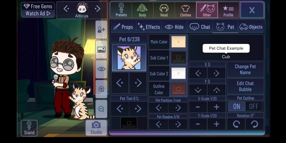 Pet: You can choose from 20 different pets including dogs, squirrels, cubs, aliens, snails, sharks, and more. Pets can also be personalized like OCs with different colors, positions, shadow, and tints.