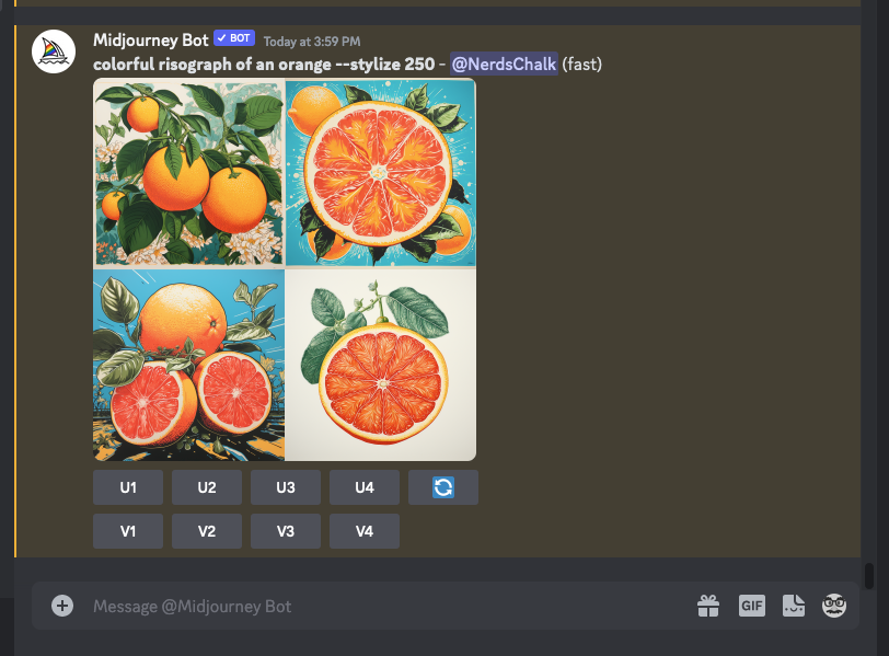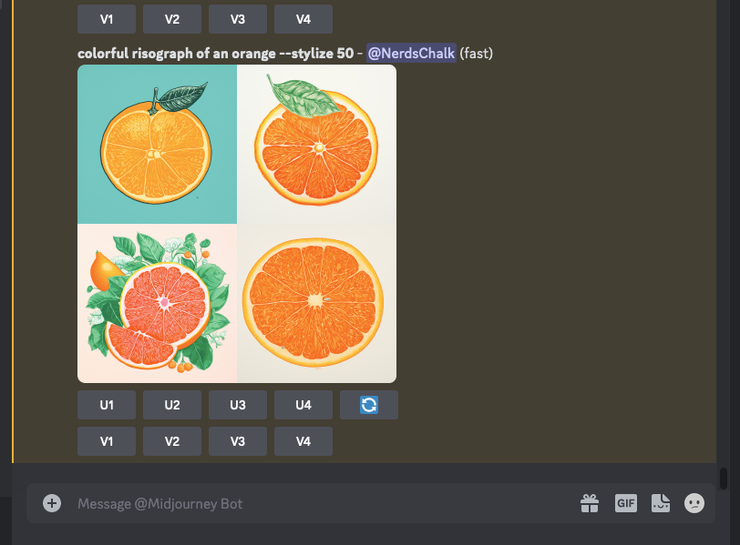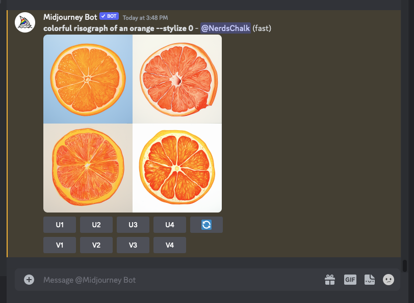 This is what we created with the Stylize parameter using “colorful risograph of an orange” and seed value 101 on Midjourney.