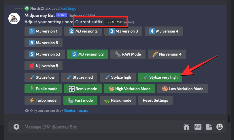 Depending on the stylize value you want to set from these above options, you can choose your desired setting from the Midjourney response. When you choose an option from here, the selected Style setting will be highlighted in green and you’ll see your chosen stylize value specified adjacent to “Current suffix:” at the top of Midjourney’s response.