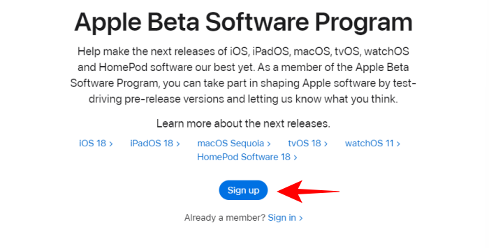 - Go to beta.apple.com and click on Sign up.