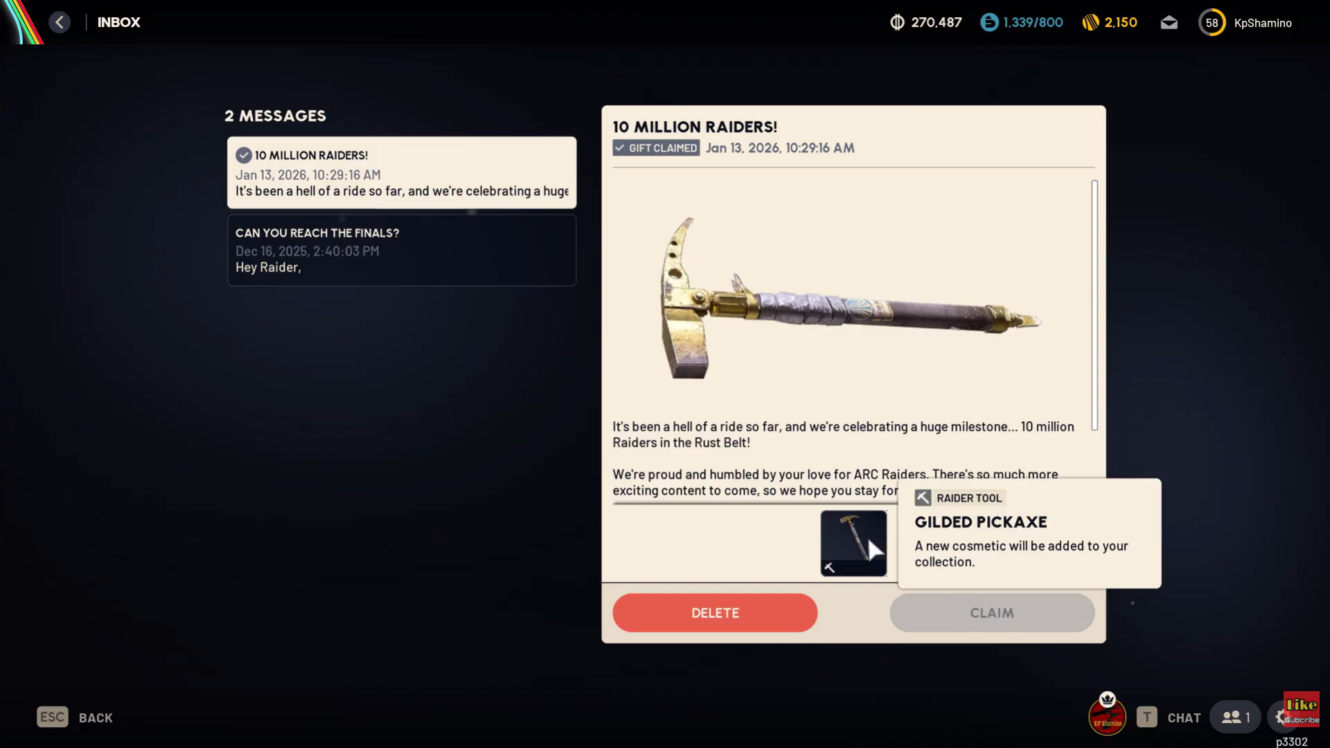 Once the milestone reward is live, the Gilded Pickaxe is automatically granted. You’ll find it either directly in your tool inventory or delivered via the in-game inbox.