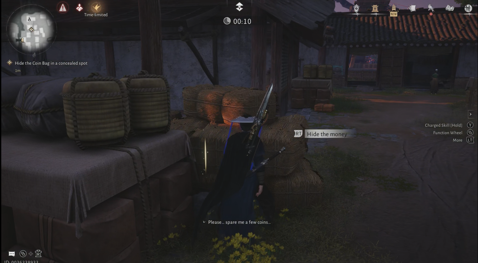 Hide the bag of coins in a concealed spot. A cutscene will show Lord confiscating the coins after finding them.