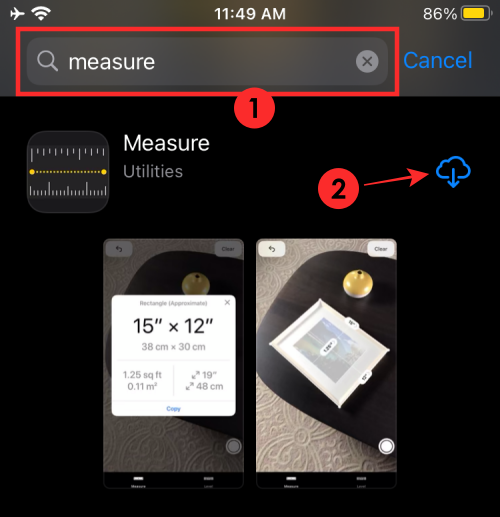 When you find the Measure app listed in the search results, tap on the ‘Get’ button or Download icon (the one with a cloud and a downward-facing arrow) to install the Measure app on your iPhone.