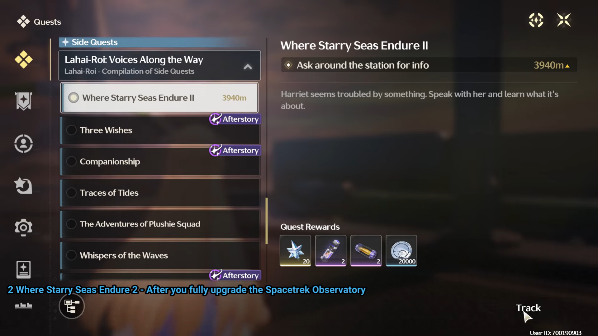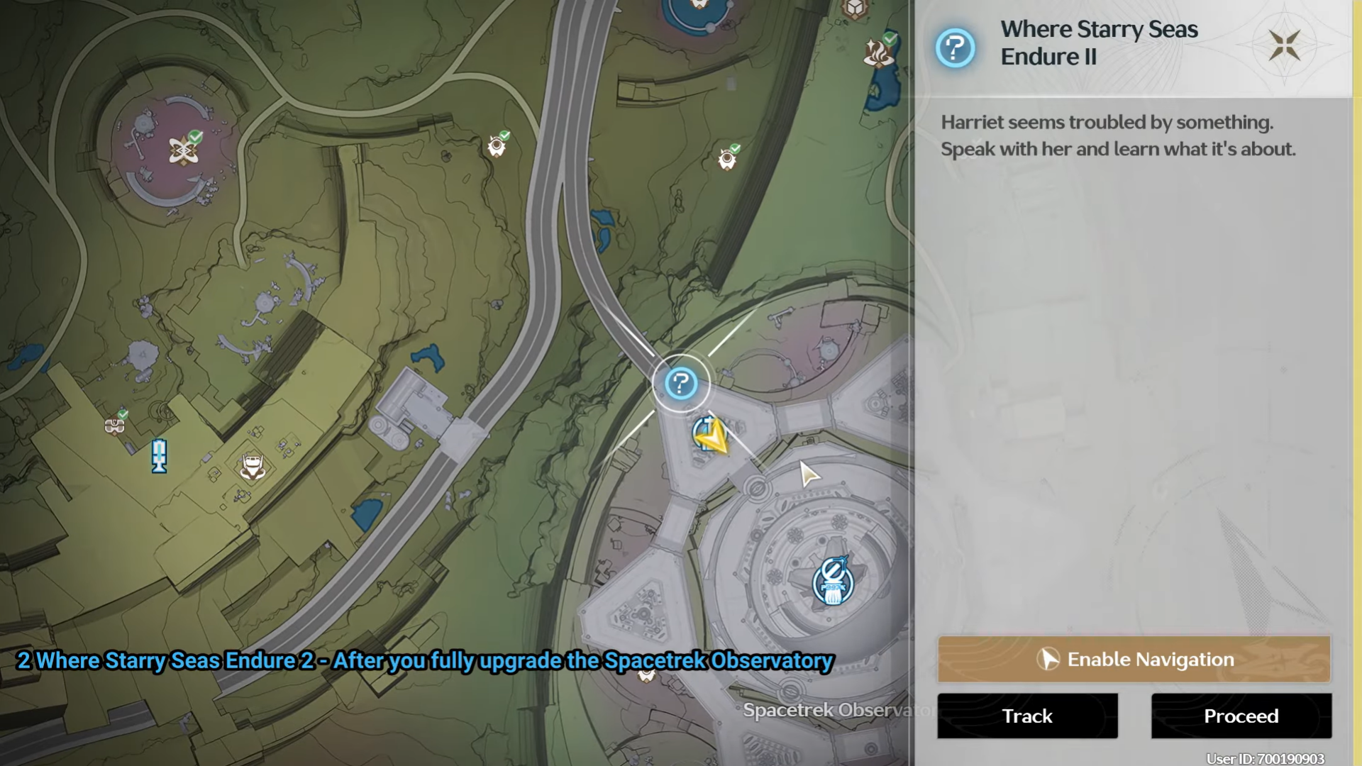 Travel back to the Spacetrek Observatory and reply to Harriet. This completes the Where Starry Seas Endure quest Part 2.