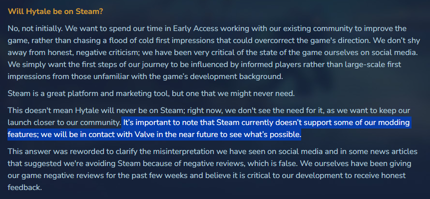 Because the game development hasn't been smooth, developers have also chosen not to launch it on Steam and "avoid negative reviews because of the state of the game." Developers have also mentioned that Steam doesn't support some of the game's modding feature.