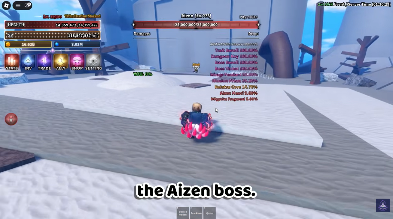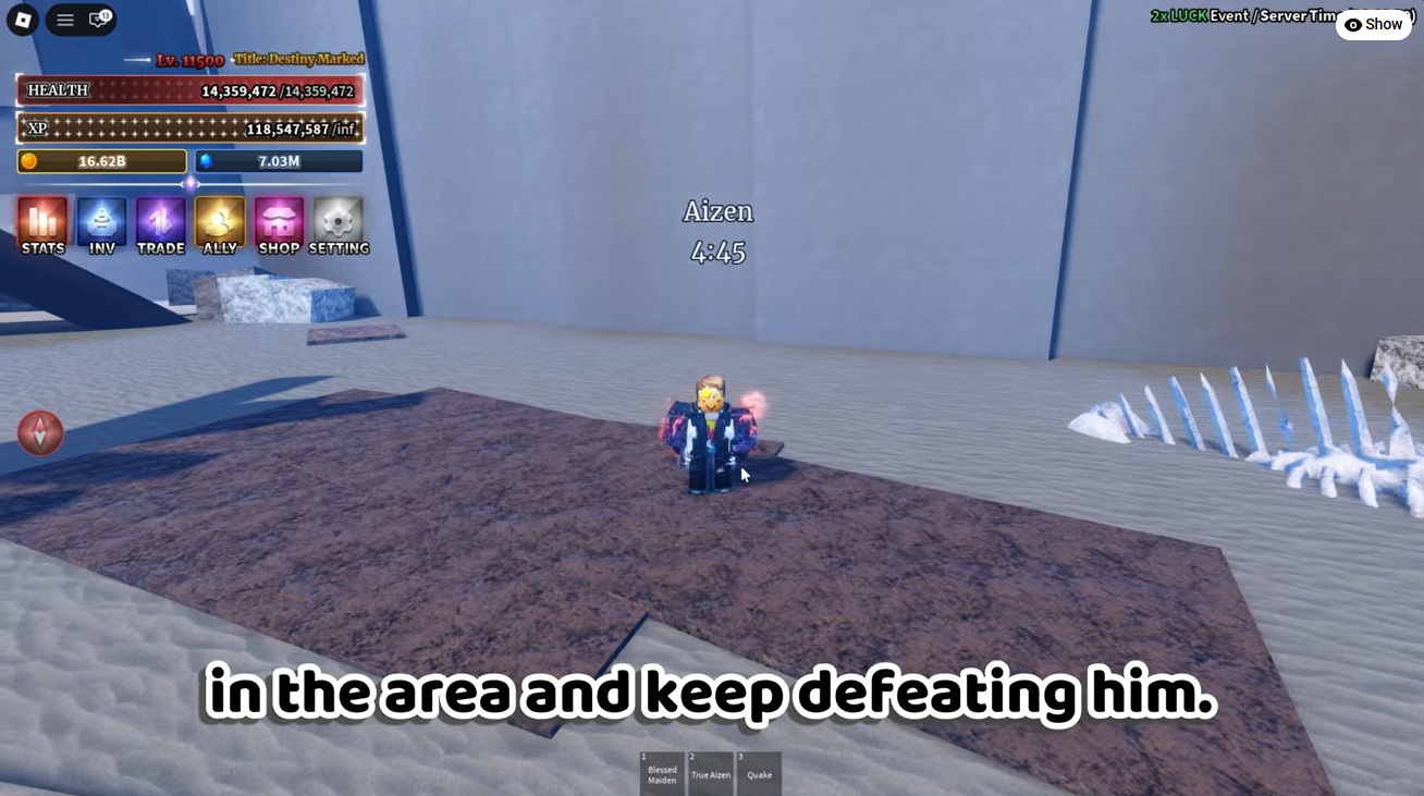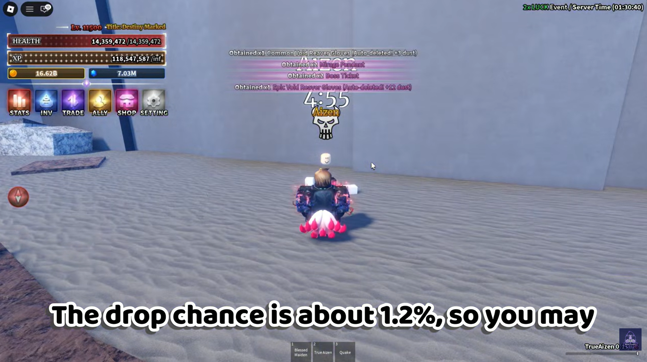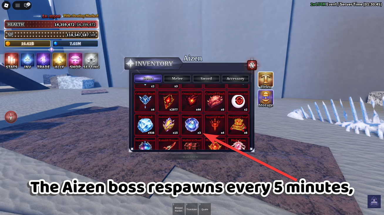 Once the boss is defeated, wait for the respawn timer to finish. The Aizen Boss respawns every 5 minutes, making it one of the more farmable bosses in the game.