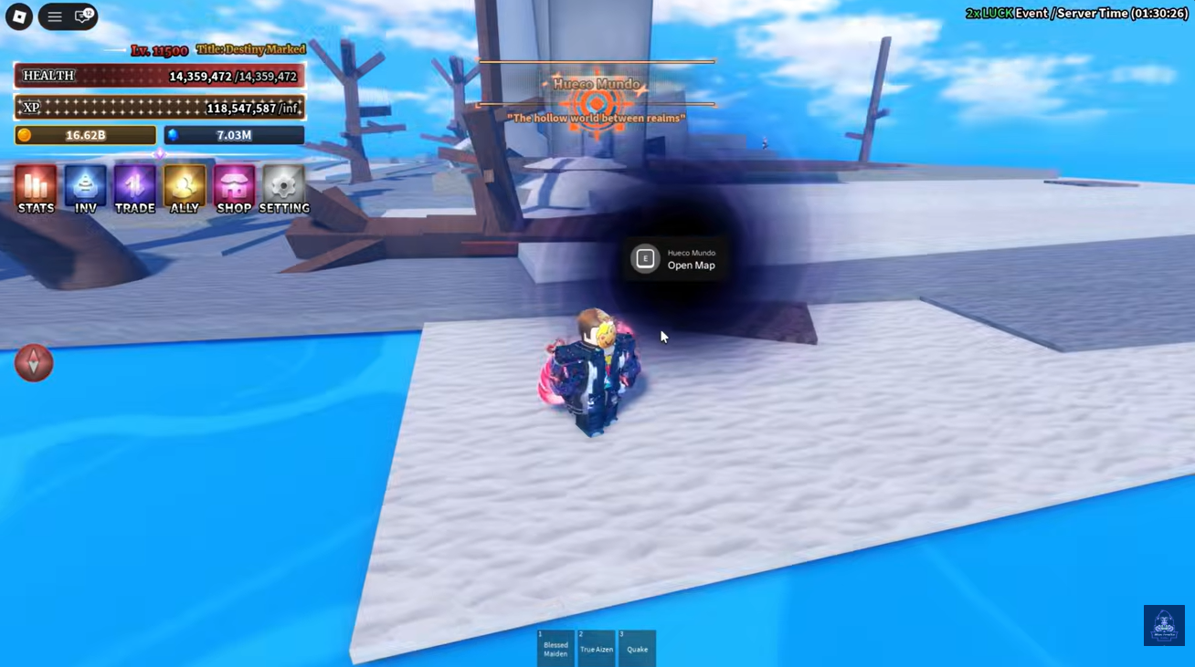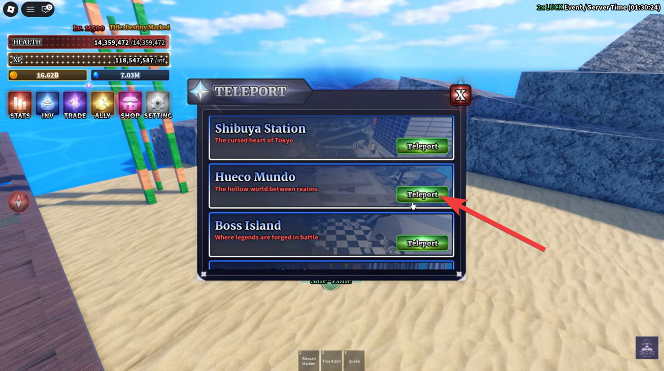 Before starting the farm, you must travel to Hueco Mundo Island. This island is typically accessible through the main sailing system in Sailor Piece. Players with higher progression levels will already have access to this region, but newer players may need to unlock the area first.