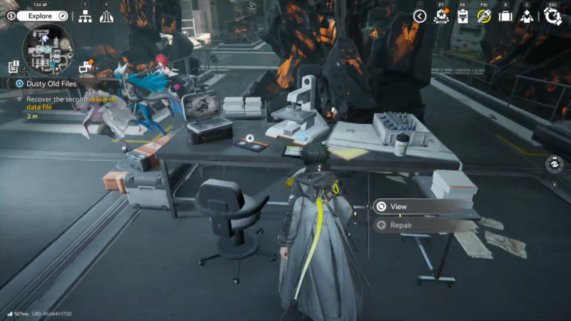 Approach the table on the right to find the second research data, complete the repair logic interaction, then read the data to progress.