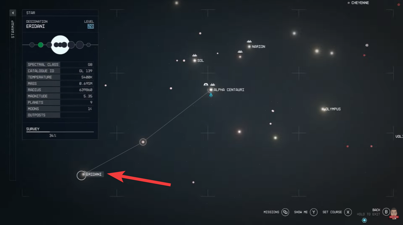 Identify the gas giant with red rings and select its moon Eridani VII-c. This ensures you’re targeting the correct celestial body.